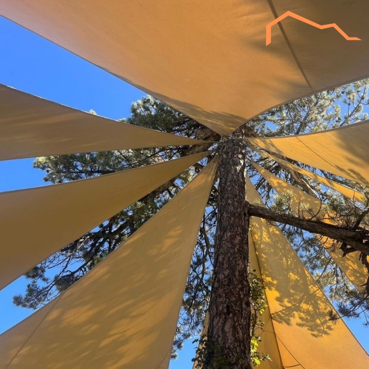 Driehoekig doek in canvas of pvc stretch – strak design en hogere water-/windbestendigheid.