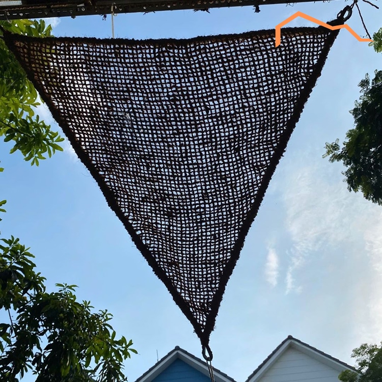 Driehoekig doek van kokosvezel, maat 3×4×5m, speelse vorm en natuurlijke structuur.